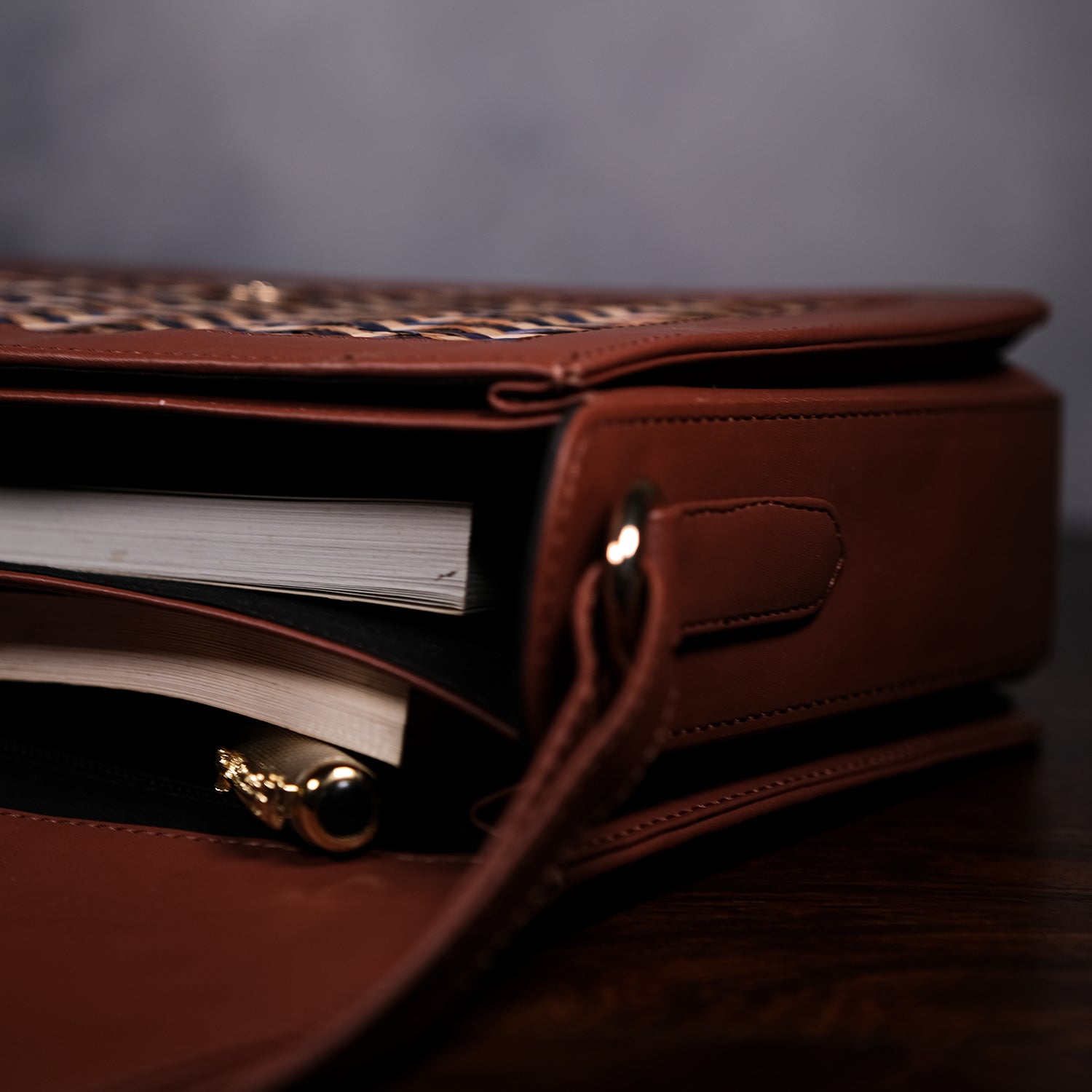 Elevate your everyday style with our latest Sling Bag in blue & biege—where elegance meets craftsmanship. Designed with a distinctive woven pattern, this bag seamlessly blends natural fibres into an eye-catching zigzag texture. Rich brown leather accents complement the design, offering a touch of sophistication and unmatched durability.