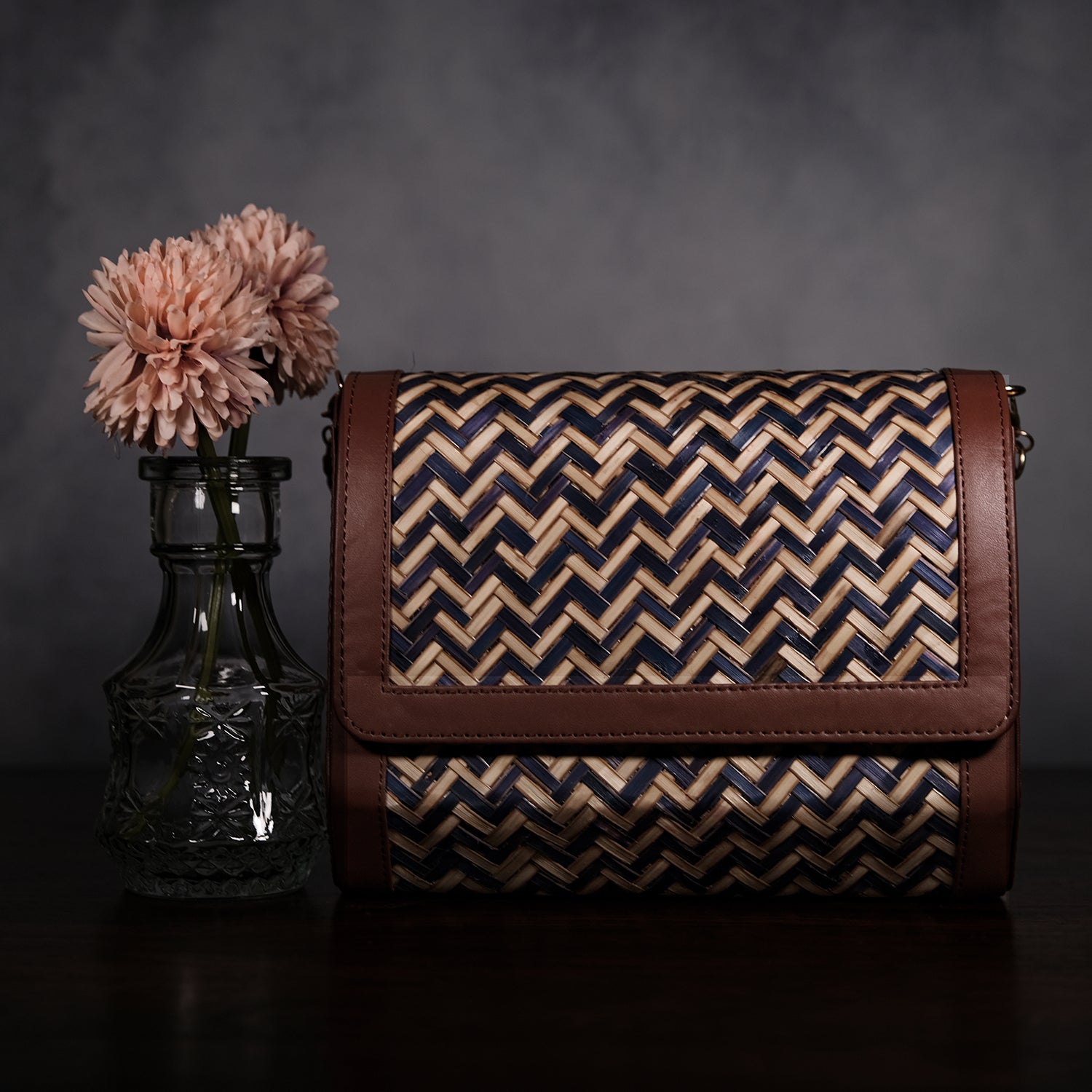 This exquisite sling bag features a captivating chevron pattern in shades of blue and beige, beautifully paired with rich brown faux leather accents that enhance its sophisticated appeal. Crafted with meticulous attention to detail, the bag boasts a robust design and an adjustable strap for effortless wearability.